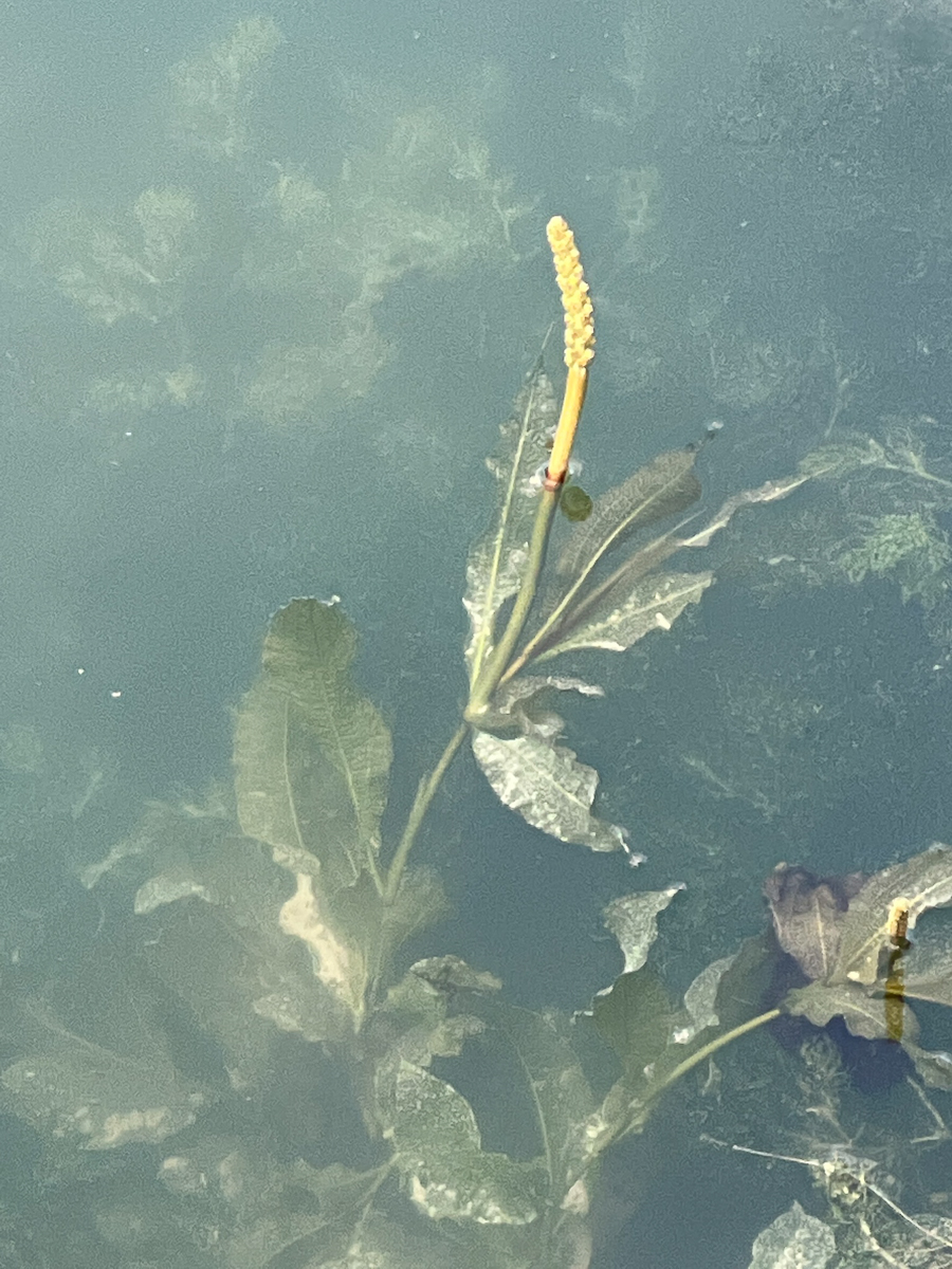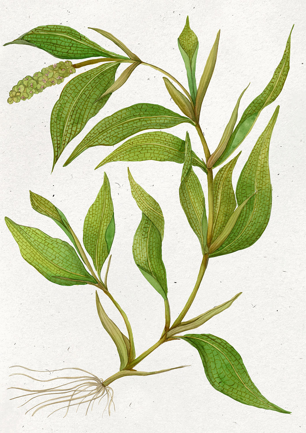 Leaves: All leaves are similar and submerged, nearly sessile, membranous, translucent, with a reticulate transparent venation; lanceolate blade with a scabrous-toothed margin, (7)-20-(24) cm long, (1.5)3-4.5(6) cm wide, with an acute base ending in a mucro 2-4(10) mm long. Persistent stipules, free, lanceolate and rounded at the apex, up to 8 mm long.