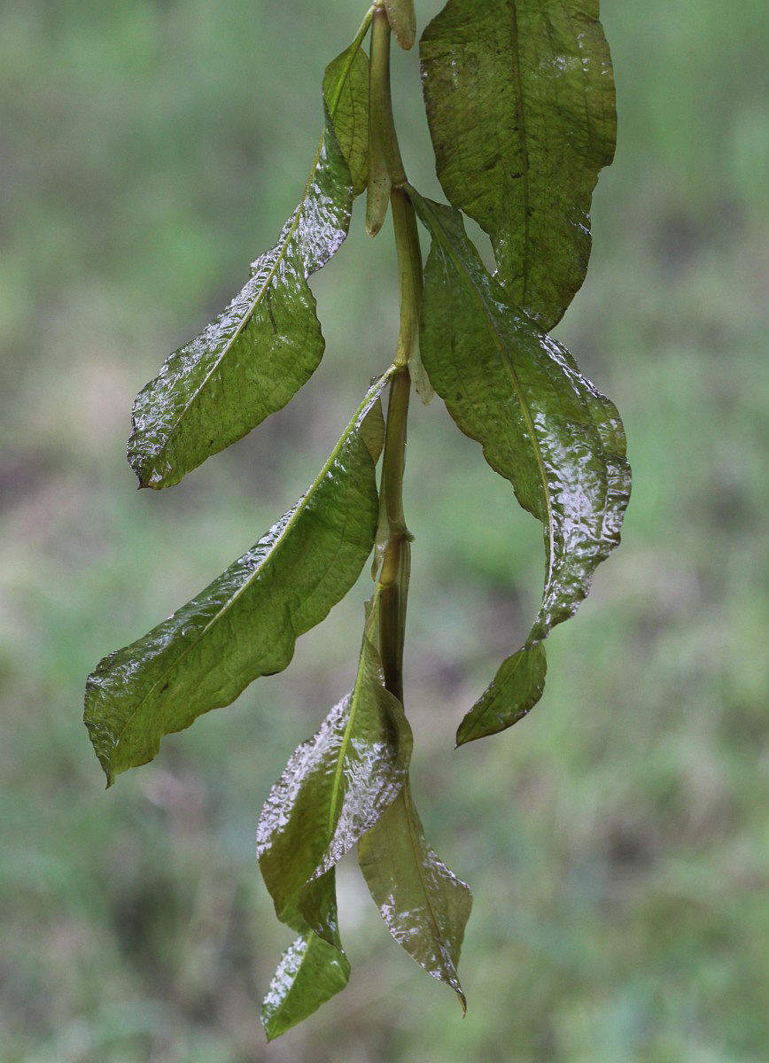 Foglie: foglie tutte simili e immerse, subsessili, membranose, pellucide, con nervatura reticolata trasparente; lamina lanceolata a margine scabro-dentellato, lunga (7)-20-(24) cm, larga (1,5)3-4,5(6) cm, a base acuta terminante in un mucrone lungo 2-4(10) mm. Stipole persistenti, libere, lanceolate arrotondate all’apice, lunghe sino a 8 mm.