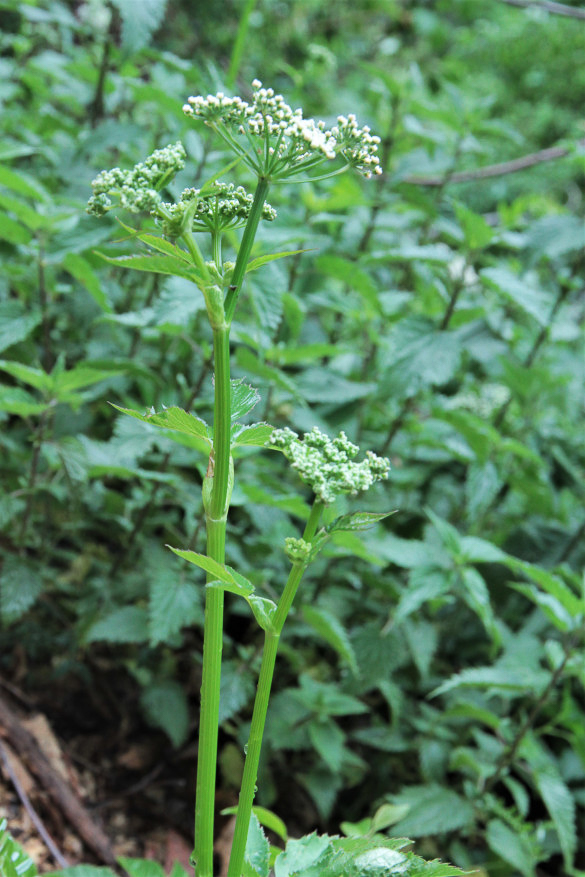 Leaves: Green-grayish leaves, the basal ones with a long petiole (20-30 cm) that are keeled, grooved and triangular, with a short sheath; compound blade, biternate or triternate with a triangular outline, divided into large segments, 3-4 cm wide, ovate-lanceolate, with an asymmetric heart-shaped base and acuminate apex, unevenly serrated at the margin; the cauline leaves are ternate, sessile, with the petiole reduced to a 2-3 cm sheath.
