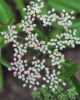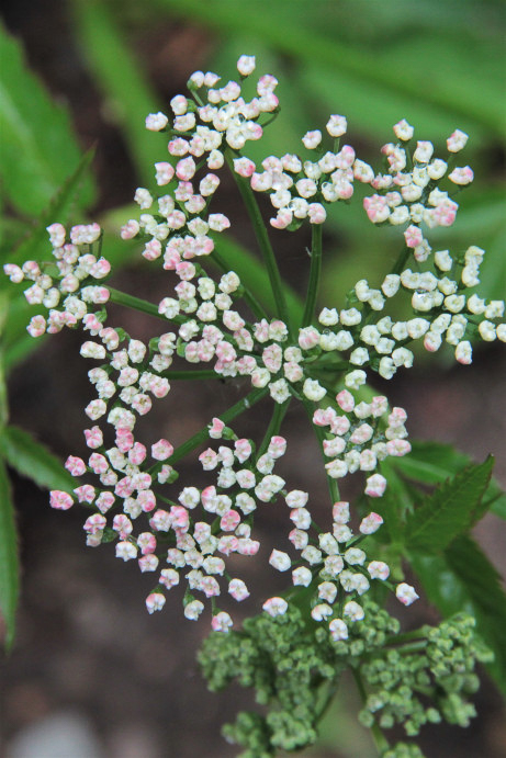 Flowers: The inflorescence is a compound umbel on long (8-10 cm) axillary peduncles with 10-20 rays of 2-3 cm. Umbels and umbellets lack involucres. The corolla has 5 white or slightly pink, obovate and bifid petals, extended into a curved tongue.